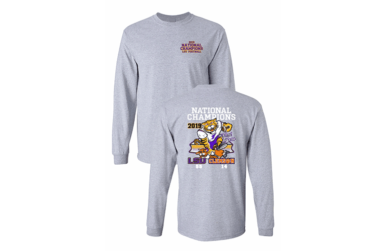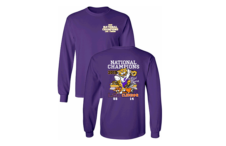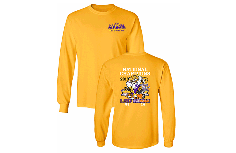 The 2019 LSU Clemson National Champs t-shirt is available in short and long sleeve options in purple, grey, yellow, or black.